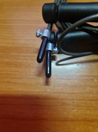 Comba de velocidad con mangos ergonómicos de color negro. El cable es de color gris y está enrollado con bridas verdes. - Mangos texturizados para un mejor agarre. - Cable de acero recubierto. Sin uso. Modelo DOMYOS velocidad cross training speed jump rope de Decathlon. Precio nueva 9,99 €