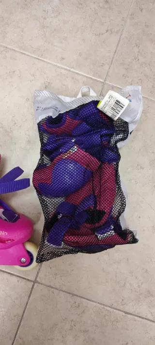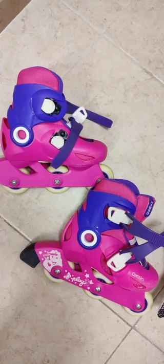 Se venden patines infantiles en color rosa y azul. Son ajustables para adaptarse al crecimiento. - Cierre de velcro y hebilla. - Ruedas resistentes. - Diseño divertido con dibujos. - Incluye protecciones: Rodilleras, coderas, muñequeras.