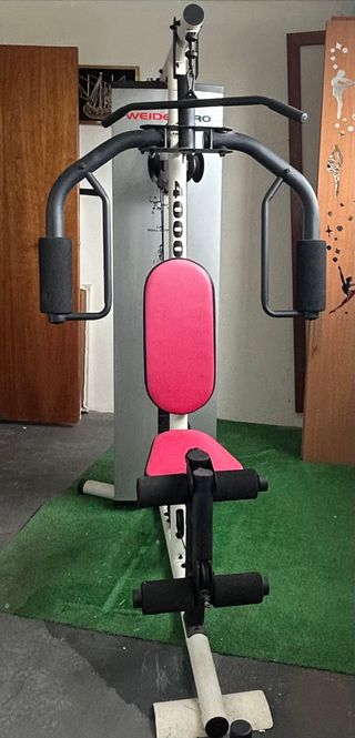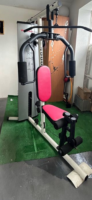 Estación de musculación completa para entrenar en casa. - Estructura robusta. - Asiento y respaldo acolchados en color rosa. - Incluye barra para dominadas y poleas.
