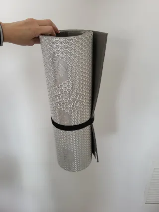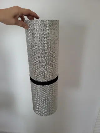 Esterilla enrollable de color gris con un diseño texturizado y una banda elástica negra para sujetarla. - Diseño geométrico en relieve. - Banda de sujeción negra.