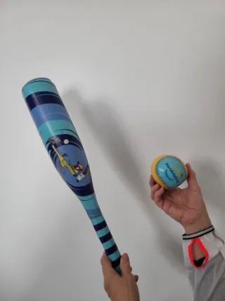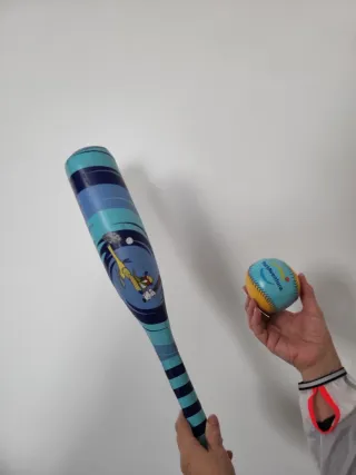 Set de béisbol infantil con bate y pelota. - Bate de plástico con diseño de rayas azules y personaje. - Pelota de goma amarilla con logo PortAventura.