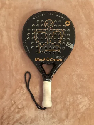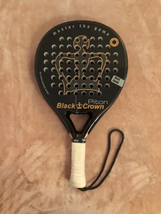 Pala de pádel Black Crown Piton en color negro con detalles dorados. Presenta el logo de la corona y el nombre de la marca. - Diseño con agujeros. - Cordón de seguridad negro. - Grip blanco. Grieta que se ve en la foto, funciona pero mejor repararla para sacarle el 100% de su potencial