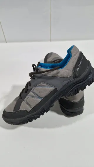 Zapatillas de trekking Quechua en color gris y azul. - Diseño deportivo. - Suela de goma. - Cierre con cordones.