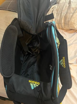 Bolsa deportiva de la marca Adidas con un diseño moderno y llamativo. - Color negro con detalles en azul y amarillo. - Logo de Adidas en grande. - Cremallera lateral. - Rayas horizontales en la parte inferior.