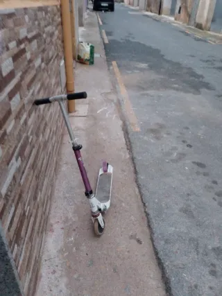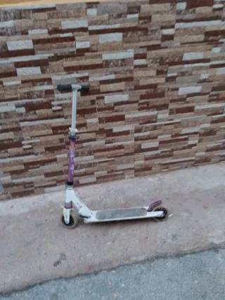 Patinete manual con un diseño llamativo en blanco y morado. - Manillar con empuñaduras negras. - Plataforma para los pies. - Ruedas para desplazarse. -Pecio negociable