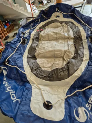 Bote hinchable. Tiene una reparación pero la última vez que se usó funcionaba sin problema. Con remos y bomba