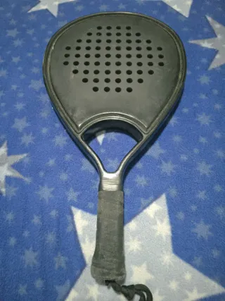 Pala de pádel de color negro. Su diseño es ergonómico y cuenta con un agarre cómodo. El mango esta desgastado - Superficie con agujeros. - Empuñadura con cinta. - Cordón de seguridad.
