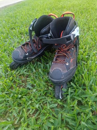 Patines en línea Oxelo en color negro y naranja, diseñados para niños. Cuentan con cordones y cierres de velcro para un ajuste seguro. - Cierre con velcro y hebilla. - Ruedas de poliuretano. - Bota acolchada para mayor comodidad.
