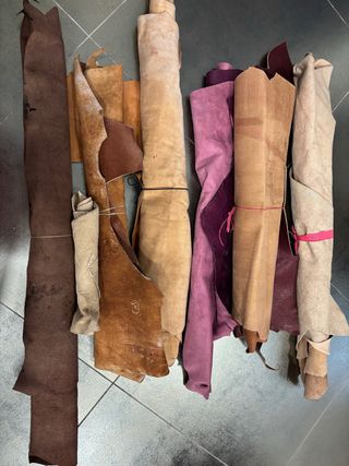 Lote de retales de piel en diferentes tonos y texturas. Ideales para manualidades, marroquinería o proyectos de artesanía. - Pieles de distintos grosores. - Variedad de colores: marrón, beige, rosa, burdeos. - Texturas suaves y naturales. Procedentes de fábrica de zapatos y bolsos. El precio es para todo el lote.