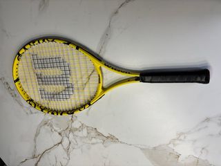 Raqueta de tenis Wilson para niños con diseño de Minions. Su color amarillo la hace muy llamativa. tamaño 3 7/8 - Marco de color amarillo. - Diseño inspirado en Minions. - Cuerdas negras.
