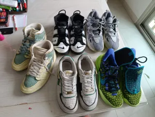 zapatillas deportivas de diferentes estilos y marcas. Talla 38,5 menos las converse que son talla 40,5( tallan pequeño). - Zapatillas Nike retro altas de color verde y crema. 30€ - Zapatillas Nike altas en blanco y negro. 40€ - Zapatillas Adidas grises de estilo moderno. 25€ - Zapatillas Nike blancas y verdes con detalles dorados. 40€ - Zapatillas Converse deportivas de colores vibrantes, verde y azul. 30€