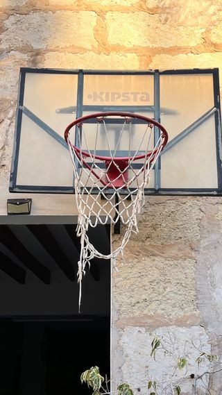 Canasta de baloncesto de la marca Kipsta, ideal para practicar este deporte. - Aro de metal rojo. - Tablero de plástico translúcido. - Red de malla blanca.