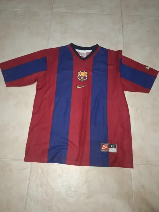 Camiseta original del FC Barcelona de la temporada 1998-1999. - Talla XL. - Diseño a rayas rojas y azules. - Logo del FC Barcelona y Nike. - Cuello en V. - No hago envios