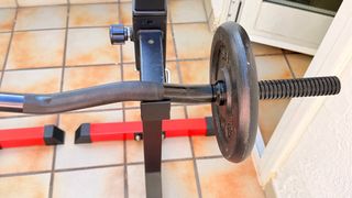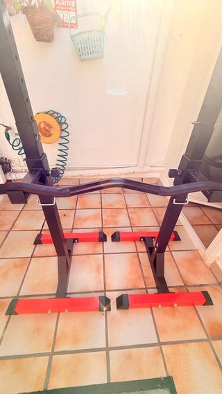 Soporte robusto para ejercicios con pesas y barra Z. Ideal para tu gimnasio en casa. - Estructura de metal negro. - Barras de apoyo rojas. Con dos discos de 5 kilos
