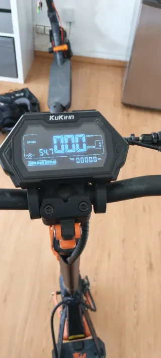 Patinete eléctrico Kukirin G2 Pro en color negro y naranja. Diseñado para ofrecer una experiencia de movilidad urbana. - Pantalla digital multifunción. - Diseño plegable para facilitar su transporte y almacenamiento. - Ruedas de gran tamaño para mayor estabilidad. Usado está bien estado le funciona todo tiene su sillín se puede limitar y deslimitar