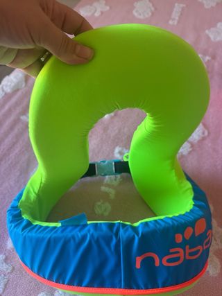 Salvavidas de la marca Decathlon, diseñado para niños y niñas. Ideal para aprender a nadar o para juegos en el agua. - Color azul y verde neón. - Talla para 25-35 kg. - Cierre ajustable con hebilla.