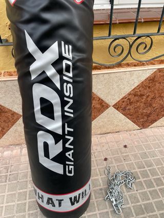 Saco de boxeo de la marca RDX, modelo Giant Inside. Ideal para entrenamiento. - Color negro con detalles plateados y rojos. - Incluye cadena para colgar.