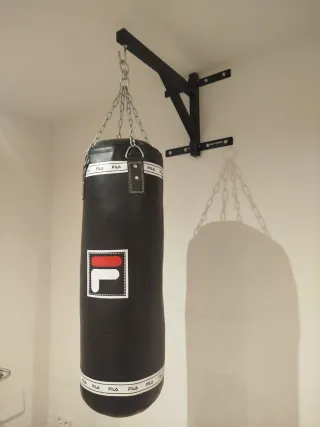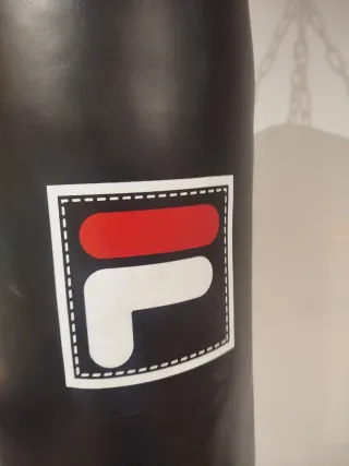 Se vende saco de boxeo de la marca Fila, en color negro, con su soporte de pared. - Saco de boxeo con logo Fila. - Soporte de pared resistente para colgar el saco.