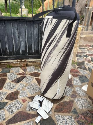 Saco de boxeo Decathlon Outshock con un diseño de pinceladas en blanco y negro. Incluye un par de guantes de boxeo blancos. - Saco de boxeo con asas. - Guantes de boxeo blancos.
