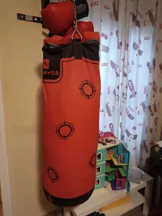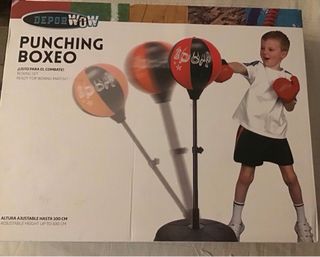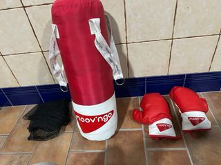 Kit de boxeo para niños con saco y base. - Saco de boxeo con diseño bicolor rojo y negro para niñ@s - Altura ajustable: de 79 a 118 cm. MEDIDAS: 67 x 19 x 118 cm - Par de guantes Se ha utilizado un par de veces que no sumará ni una hora. No tengo la caja original, esta nuevo. En juguettos buevo cuesta 25€.