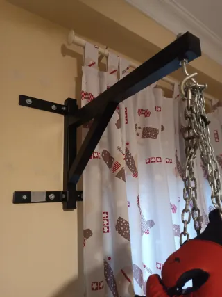 Se vende conjunto de equipamiento deportivo para entrenar en casa. - Saco de boxeo negro. - Barra de dominadas para pared.