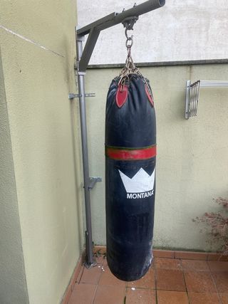 Saco de boxeo de la marca Montana, con un peso aproximado de 70 kg. Ideal para entrenamiento. cadenas oxidadas incluye el soporte hecho a medida para pared, pesa bastante - Color negro con detalles en rojo. - Incluye cadena para colgar.