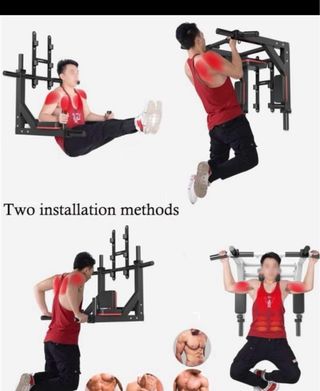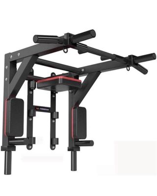 Barra de dominadas multifuncional para montaje en pared. Estructura robusta de acero negro con detalles en rojo. Soporta hasta 225 kg y su precio original es 334€ - Barras para diferentes agarres. - Acolchados para apoyo de antebrazos y espalda. - Incluye saco de boxeo pequeño.