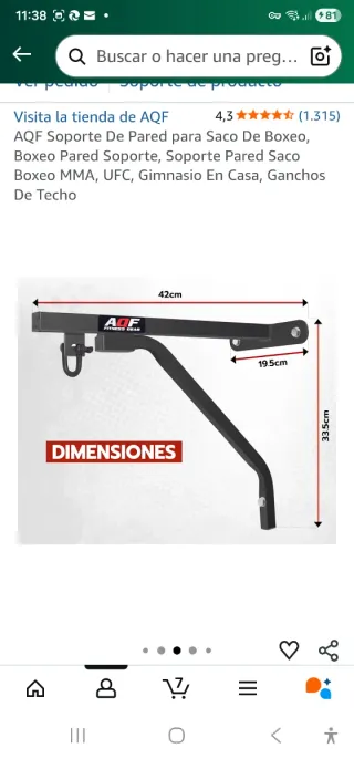 Soporte de pared robusto para saco de boxeo. Fabricado en metal resistente. - Estructura triangular para mayor estabilidad. - Gancho superior para colgar el saco. - Base con orificios para fijación a la pared.se puede ver sin compromiso un saludo