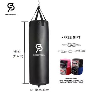 Saco de boxeo de 1.20 metros de alto, sin relleno. Ideal para entrenamientos. - Altura: 120 cm (46 pulgadas). - Diámetro: 33 cm (13 pulgadas). - Incluye cadena de suspensión. - Incluye regalo: 1 par de vendas de 3m (color aleatorio). ⭐️⭐️REGALO GUANTES DE SPARRING⭐️⭐️