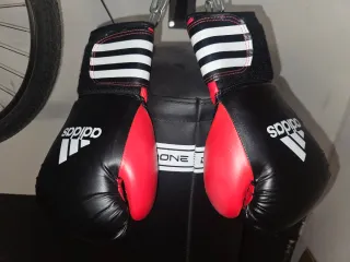 Se vende equipo completo de boxeo. - Saco de boxeo negro. - Par de guantes de boxeo Adidas negros y rojos. - Soporte para colgar el saco.