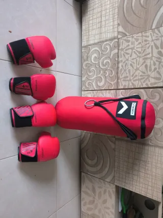Par de guantes de boxeo marca domyos: -Color: Rojo y negro. - Cierre de velcro. - Talla: 12 oz. Saco de boxeo Para colgar el saco Se vende todo junto o por separado Venta en persona no deja enviar todo por el tamaño