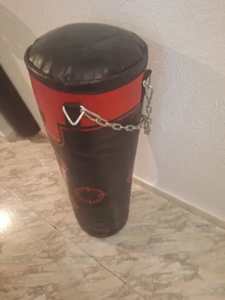 Saco de boxeo muy resistente y de alta calidad. Ideal para entrenamiento de potencia. Está en buen estado general, con desgaste estético normal por el uso (visible en fotos), pero perfectamente funcional y muy sólido. Material: cuero sintético reforzado • Muy pesado (aprox. 30–35 kg) • Anillas metálicas en perfecto estado • Ideal para entrenamiento intenso. 👉solo ofertas razonable.