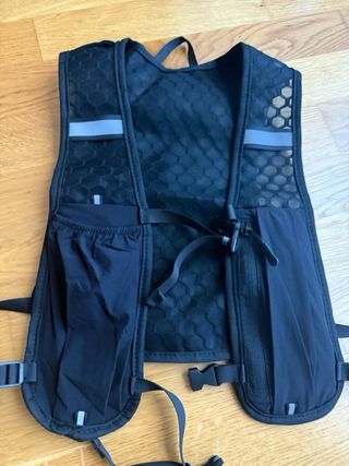Chaleco diseñado para trail running con una capacidad de 1.5 litros. Es de color negro y cuenta con un diseño de malla hexagonal. - Tejido de malla transpirable. - Bolsillos laterales. - Cintas reflectantes. Escucho tu oferta