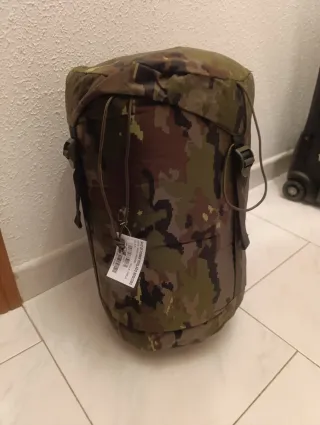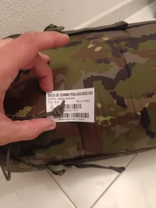 Saco de dormir con estampado de camuflaje militar. - Diseño compacto y ligero. - Cierre con cordón ajustable. - Incluye etiqueta con información.