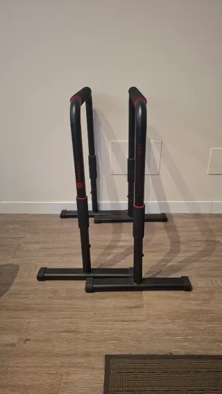 Barras paralelas Decathlon Domyos 100 para calistenia. Diseñadas para entrenamientos versátiles. - Estructura de metal resistente. - Mangos acolchados para mayor comodidad. - Altura ajustable. - Dos unidades con acolchados totalmente nuevos por no uso. *Precio NO negociable (ya rebajado)