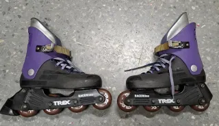 Par de patines en línea marca Trex, modelo RacerLine. Diseñados para un patinaje ágil y divertido. Número 38 - Color principal morado y negro. - Cierre de hebilla y cordones. - Ruedas de poliuretano.