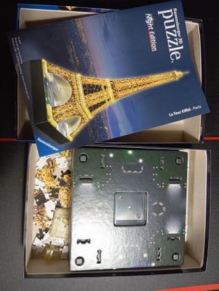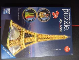Puzzle 3D de la Torre Eiffel en su edición nocturna de Ravensburger. Construye una réplica detallada de este icónico monumento. - Incluye 216 piezas de plástico. - Piezas de plástico estables. - Incluye 2 LEDs para iluminar el puzzle. - Dimensiones: 47 cm / 18.5 pulgadas.