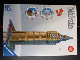 Puzzle 3D de Ravensburger que representa el icónico Big Ben de Londres. Cuenta con la tecnología Easyclick para un montaje sin pegamento. - 216 piezas de plástico. - Dimensiones: 41 cm / 16 pulgadas. - Apto para edades de 10 a 99 años.