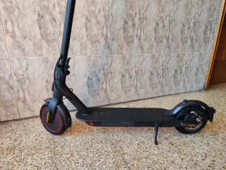 Patinete eléctrico de color negro, muy poco uso (no más de 30 usos la mayoría de desplazamiento corto) y con su correspondiente rueda y cargador. - Manillar ajustable. - Ruedas con llantas rojas. - Freno trasero. - Pata de apoyo.