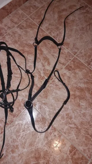 Conjunto de cabezada y pechopetral para caballo talla COB hasta caballos de 1.60 - Cabezada de cuero con riendas y filete - Pechopetral con tiras elásticas y tijerillas Tiene uso pero se puede usar aún sin problema Color marron Caballos ponys hipica equitacion salto doma