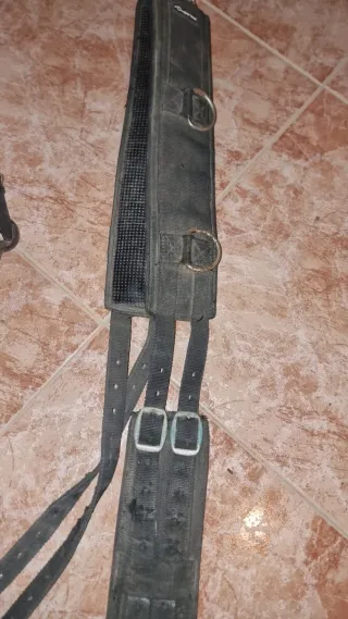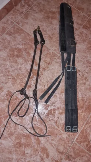 Conjunto de cinchuelo y gomas para trabajar al caballo a la cuerda o pie a tierra las hebillas y anillas tienen restos de óxido pero se puede usar aún Talla cob/full