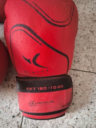 Set de equipo de boxeo que incluye guantes rojos y una palma de entrenamiento. - Guantes de boxeo en color rojo. - Palma de entrenamiento roja con agarres negros.