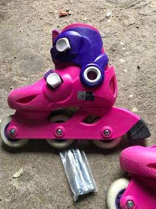 Patines infantiles en color rosa y morado. con opcion de cambiar una rueda delantera y dos traseras - Talla ajustable de la 26 a la 28. - Cierre hebilla. - Ruedas de patinaje en línea.