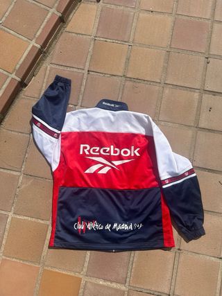 Chaqueta deportiva Reebok del Atlético de Madrid de la temporada 98/99. Diseño clásico con los colores del equipo. - Logo de Reebok en el pecho. - Banda con logo de Reebok en las mangas. - Escudo del Atlético de Madrid. - Cierre de cremallera frontal.
