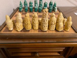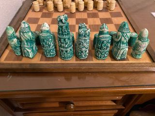 Conjunto de piezas de ajedrez de escayola. - Piezas de ajedrez de color verde y blanco. - Diseño detallado con figuras. - Incluye tablero de ajedrez.