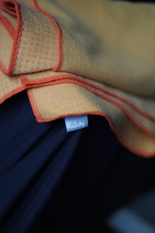 Toalla de yoga con propiedades antideslizantes, ideal para tus prácticas de Bikram Yoga. - Color principal: azafrán - Borde: naranja.