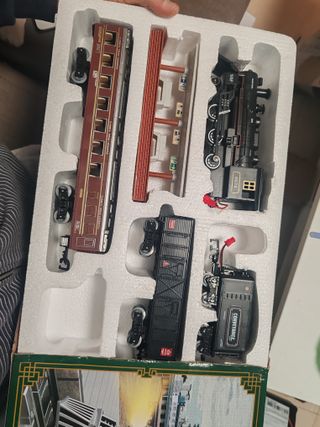 Tren eléctrico de juguete con control remoto, coche de carga y pistas. - Modelo clásico. - Ideal para niños de 3 a 8+ años. - Incluye vías y accesorios. Con luz. Versión 2. Vias y trenes metálicos. Ver imágenes Nuevo a estrenar en caja Pvp 70