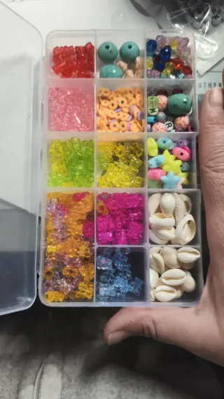 Organizador con variedad de cuentas y abalorios para crear tus propias joyas. - Cuentas de colores variados: rojas, rosas, verdes, amarillas, naranjas, fucsia, azules. - Formas diversas: ositos, estrellas, flores, aros, conchas. - Materiales: plástico, turquesa, conchas marinas. Tal como aparece en la foto. Tengo más productos de este tipo en mi perfil. Pregunta por combinaciones y así te hago descuento
