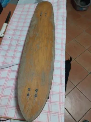 Patinete de madera con un diseño alargado y estrecho. Ideal para desplazamientos o como pieza decorativa. - Fabricado en madera. - Tornillos visibles en la parte inferior para la sujeción de los ejes.