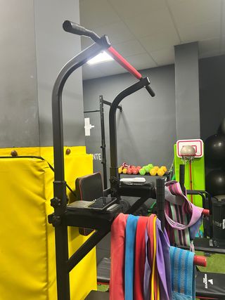 Estación de entrenamiento versátil para tu rutina de ejercicios. - Barras para dominadas y fondos. - Asiento acolchado para ejercicios de apoyo. - Bandas de resistencia incluidas.